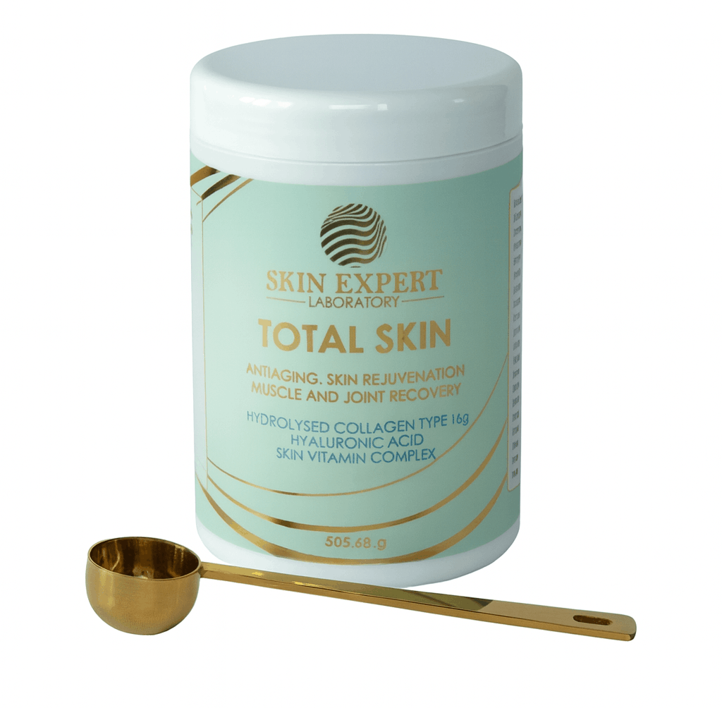 Total SKIN™ е уникална формула, включваща хидролизиран колаген, хиалуронова киселина,глицин, витамин С, Цинков Бисглицинат, Биотин (Витамин B7) ,Вит А, Вит Е, Глюкозамин сулфат- основни хранителни вещества, които насърчават здравето на кожата,косата, мускулите и съединителна тъкан.
